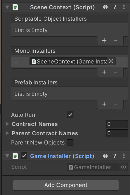 코드를 생성한 뒤, Add Component로 Installer를 추가해주고, Mono Installers에 추가해준다.