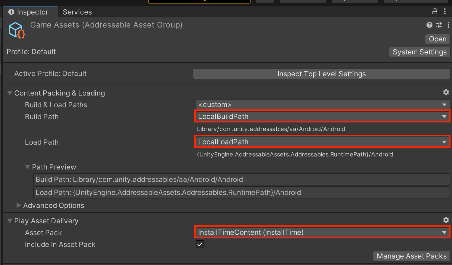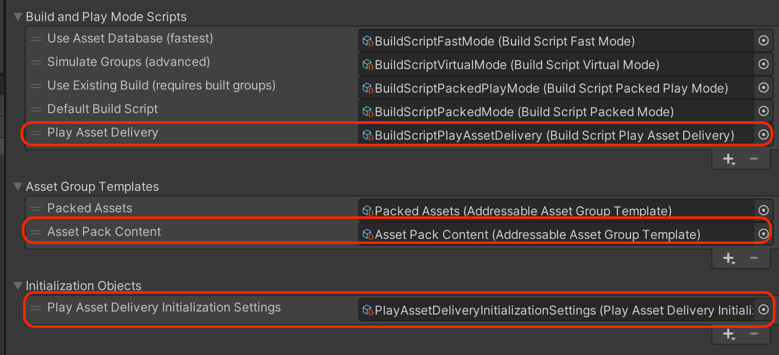 Assets/PlayAssetDelivery/Data에 들어있는 Setting값들을 위와같이 추가한다.