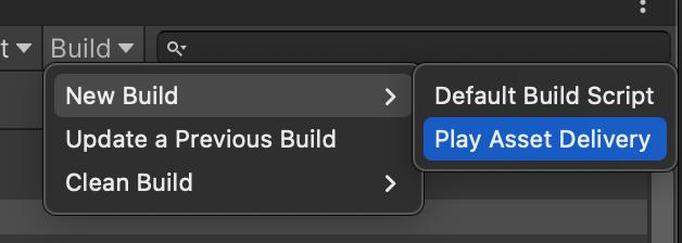 모든 세팅이 끝나면 Addressable 윈도우 창에서 [New Build] - [Play Asset Delivery]를 눌러준다. 이 빌드가 완료되면 기존처럼 AAB파일을 빌드한다.